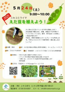 今年度第一回目のイベントは、5/24(土)に枝豆の種まきを行いました。晴天のもと26名の参加者がニセコミライの畑に集合。