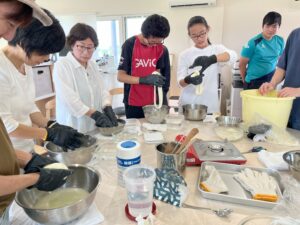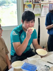 今回は、個々の好きな形に成形しました。高校生Aくんは、大きなアンパンマンの顔をつくり、パンのように両手で頬張り、見慣れないチーズの食べ方に会場が笑いで溢れました。
