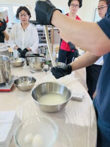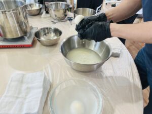 実践では、「モッツァレラチーズ」と「さけるチーズ」づくりに挑戦!どちらも白いチーズで、熱を加えると溶けて糸を引き、固まったものは、シコシコとした食感が特徴です。材料は「カード」と呼ばれる乳酸菌や酵素により牛乳が固まったもののみ。