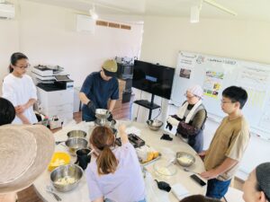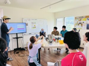 枝豆収穫後は、今年からニセコミライの住民となったチーズ工房の寺田さんを講師にチーズの講話と手づくり体験!講話では、チーズの種類や作り方の分かりやすい説明を参加者の皆さんは、興味深く聞かれていました。