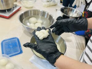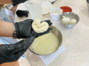 10分程、練った後に成形し、水に浸せば完成!人差し指と親指を使って、丸く絞り出すように成型すれば、ぷるんと可愛いモッツァレラチーズ。円柱に成形すれば、さけるチーズになります!
